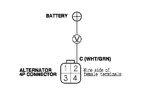 7. Measure the voltage between alternator 4P connector terminal No. 2 and the positive terminal of the battery.
