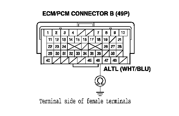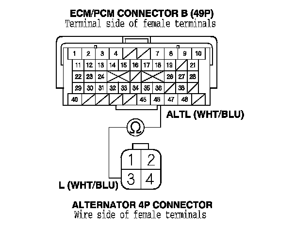 24. Check for continuity between ECM/PCM connector terminal B46 and alternator 4P connector terminal No. 3.