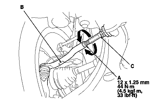 3. Loosen the tie-rod locknuts (A) while holding the flat surface sections (B) of the tie-rod end with a wrench, and turn both tie-rods (C) until the front toe is within specifications.
