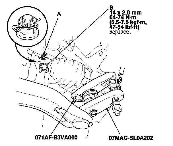 11. Remove the lock pin (A) from the lower arm ball joint, then remove the castle nut (B).