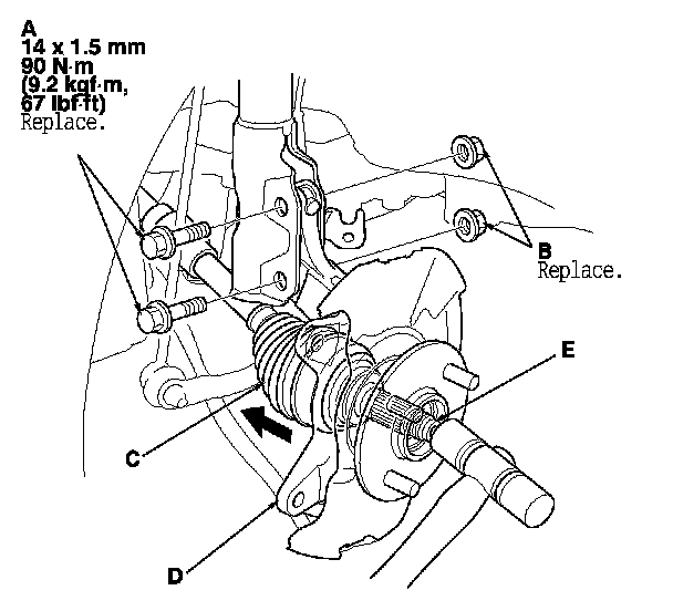 14. Remove the driveshaft outboard joint (C) from the knuckle (D) by tapping the driveshaft end (E) with a soft face hammer while drawing the hub outward, then remove the knuckle/hub.