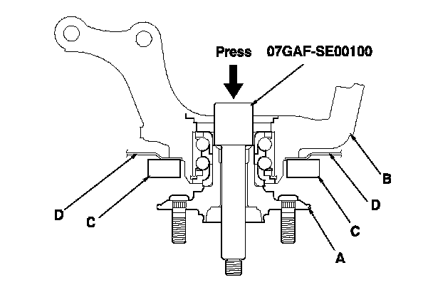 1. Separate the hub (A) from the knuckle (B) using the hub dis/assembly tool and a hydraulic press. Hold the knuckle with the attachment (C) of the hydraulic press or equivalent tool. Be careful not to damage or deform the splash guard (D). Hold onto the hub to keep it from falling when pressed clear.