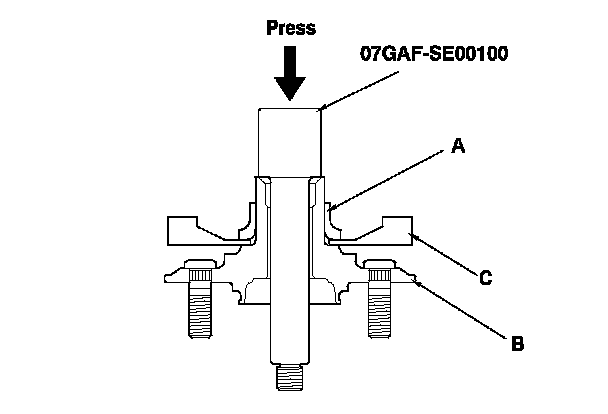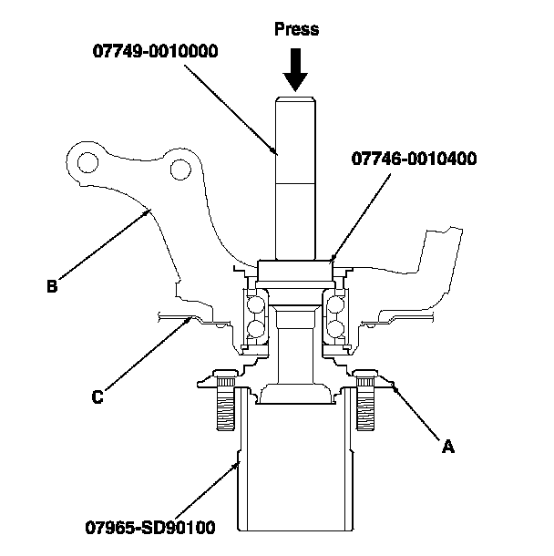 9. Install the hub (A) onto the knuckle (B) using the bearing driver attachment, the driver handle, the support base, and a hydraulic press. Be careful not to damage the splash guard (C).