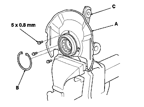 3. Remove the splash guard (A) and the snap ring (B) from the knuckle (C).