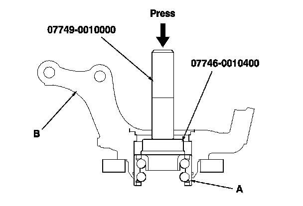 4. Press the wheel bearing (A) out of the knuckle (B) using the bearing driver attachment, the driver handle, and a press.
