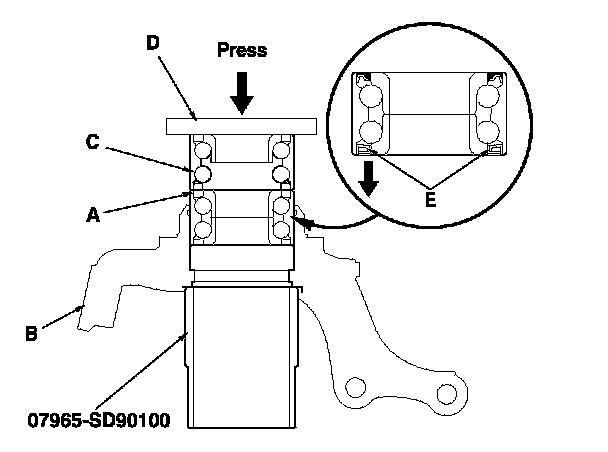 6. Press a new wheel bearing (A) into the knuckle (B) using the old bearing (C), a steel plate (D), the support base, and a press.