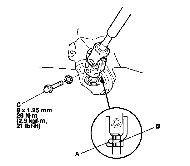 6. Align the bolt hole (A) on the steering joint with the groove (B) around the pinion shaft, then loosely install the lower steering joint bolt (C). Be sure that the joint bolt is securely in the groove in the pinion shaft.