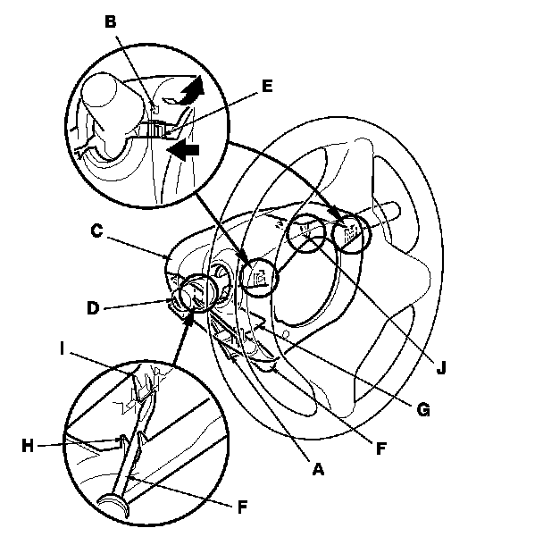 4. Release the hook (I) on the left side of the upper column cover. The right side hook (J) of the upper column cover can't be released from the inside.