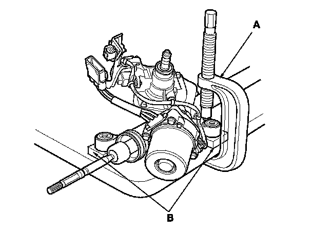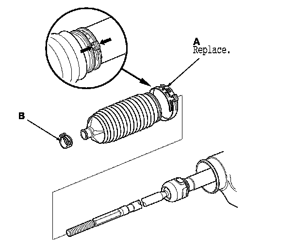 2. Remove the boot bands (A), and discard them. Remove the tie-rod clips (B), and pull the boots away from the ends of the steering gearbox.