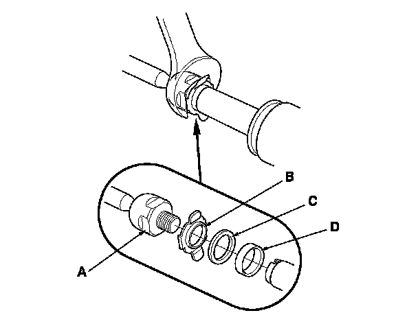 5. Unscrew both rack ends (A) with a wrench. Be careful not to damage the rack shaft surface with the wrench. Remove the rack end, the lock washer (B), the spacer (C), and rubber stop (D).