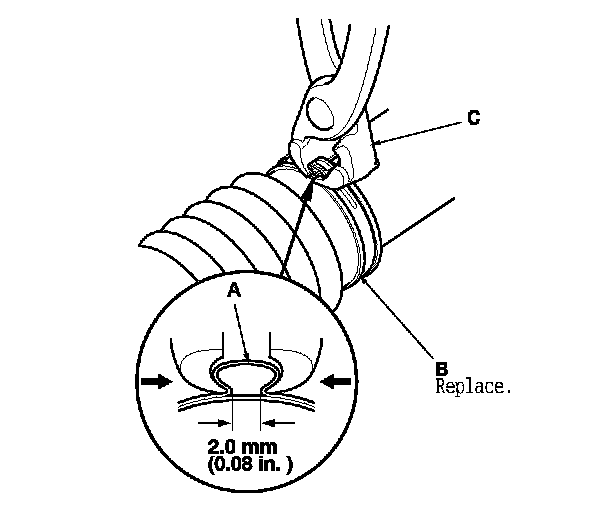 10. Close the ear portion (A) of the boot band (B) with commercially available boot band pliers, Oetiker 1098 or equivalent (C).