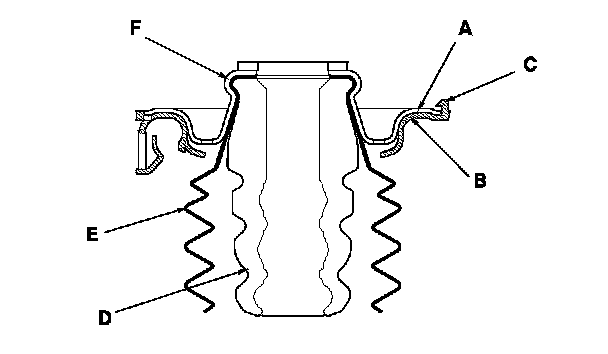 NOTE: Push the bump stop rubber and the dust cover into the dent (F) of the upper spring seat securely.