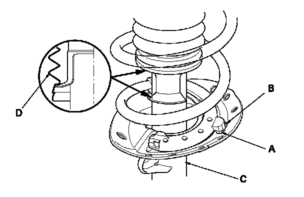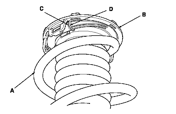 3. Install the damper spring (A) on the upper spring seat clip (B) by aligning the upper end (C) of the damper spring with the ledge portion (D) of the upper spring seat clip.