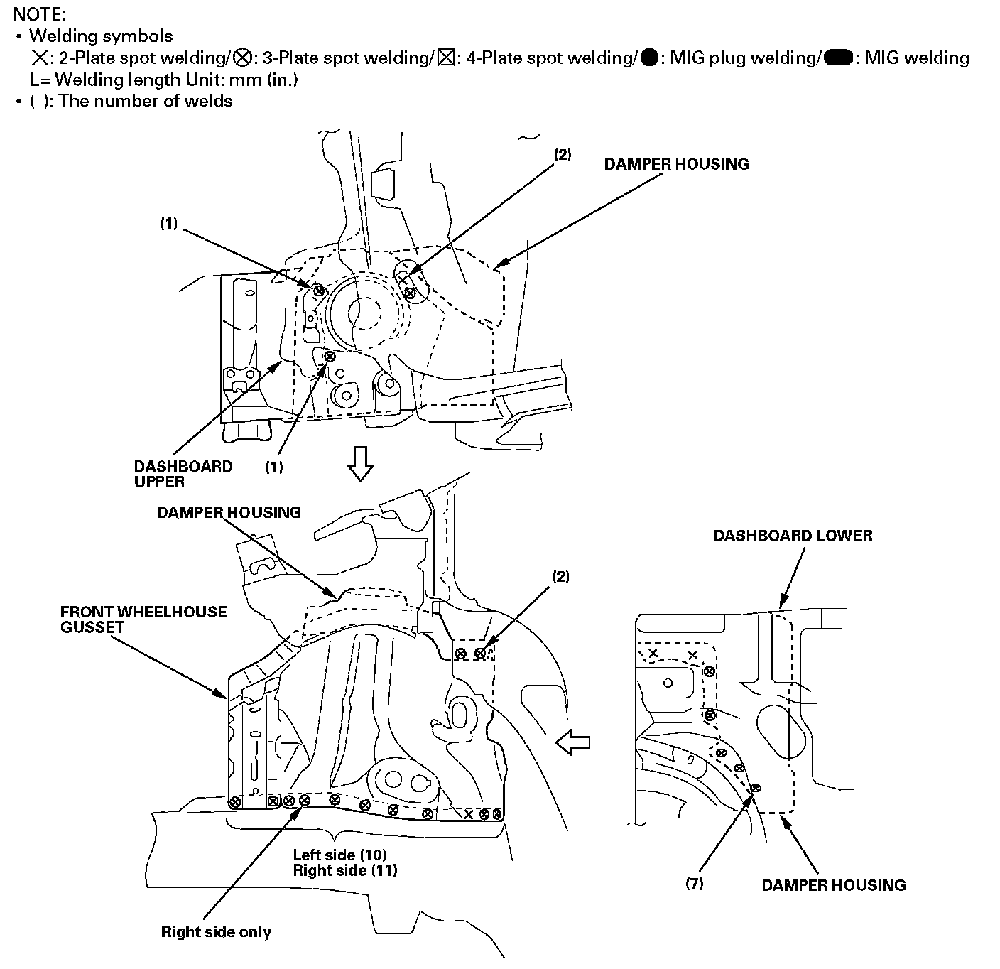 Mass production body welding positions and numbers (Wheelhouse upper member, lower member, and damper extension)