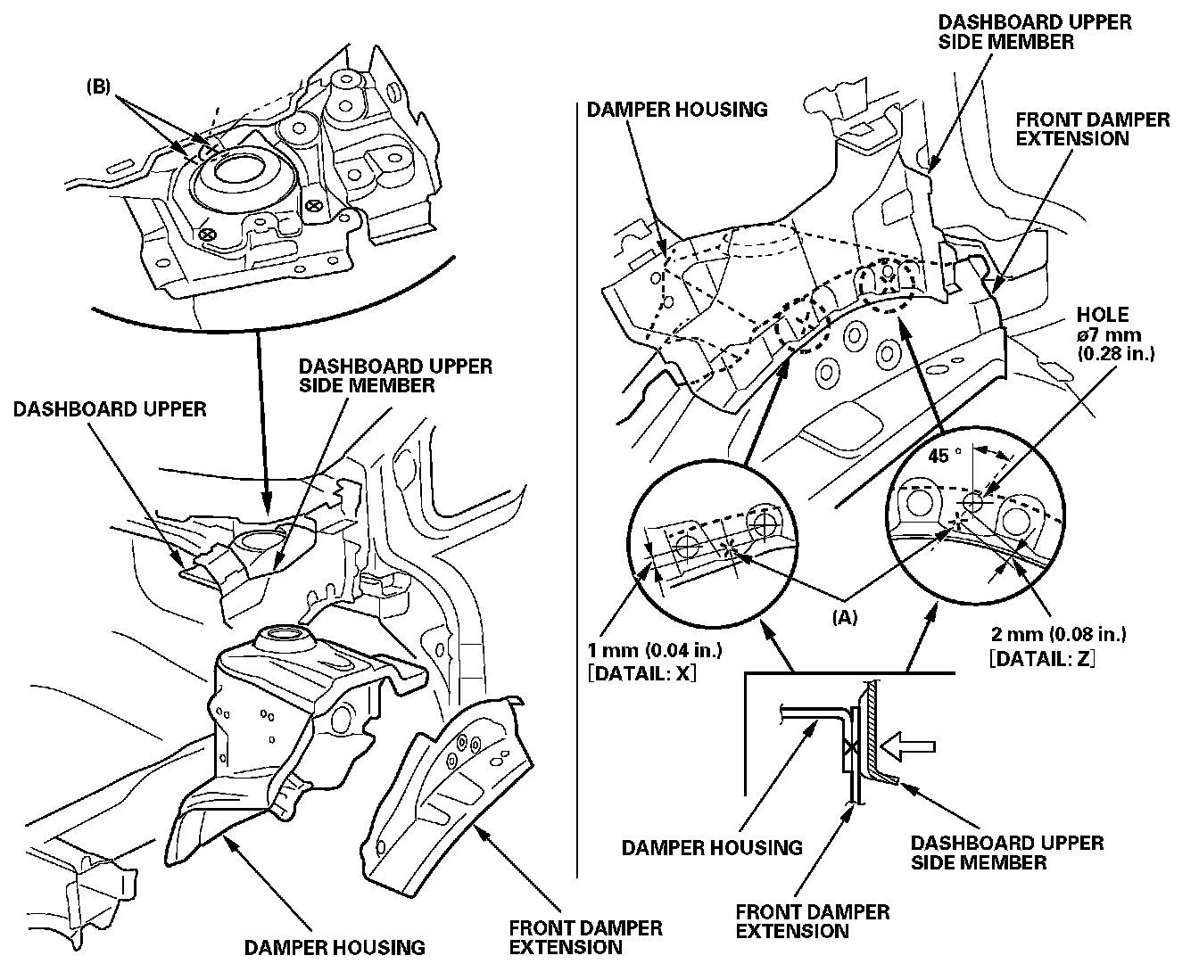 NOTE: When replacing the front damper extension, drill the position shown in DETAIL: X and DETAIL: Z from the outside of the dashboard upper side member, and drill the two spot welded points (A) at the joint for the front damper extension and the damper housing with a dia. 10 mm (0.4 in.) spot cutter.