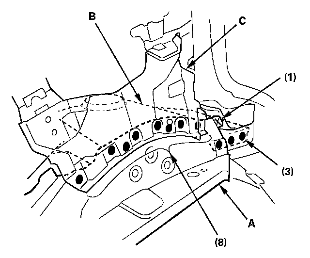 8. Drill the holes for welding the new front damper extension (A).Weld the damper housing (B), the front damper extension, and the dashboard upper side member (C).
