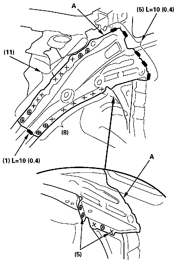 12. Weld the wheelhouse upper member (A).When reusing the wheelhouse upper member, weld it with MIG plug welding.