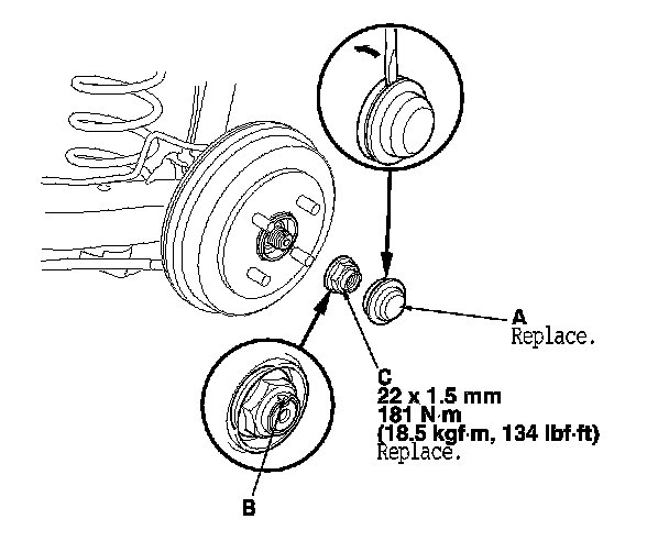 4. Remove the hub cap (A). Raise the stake (B), then remove the spindle nut (C).