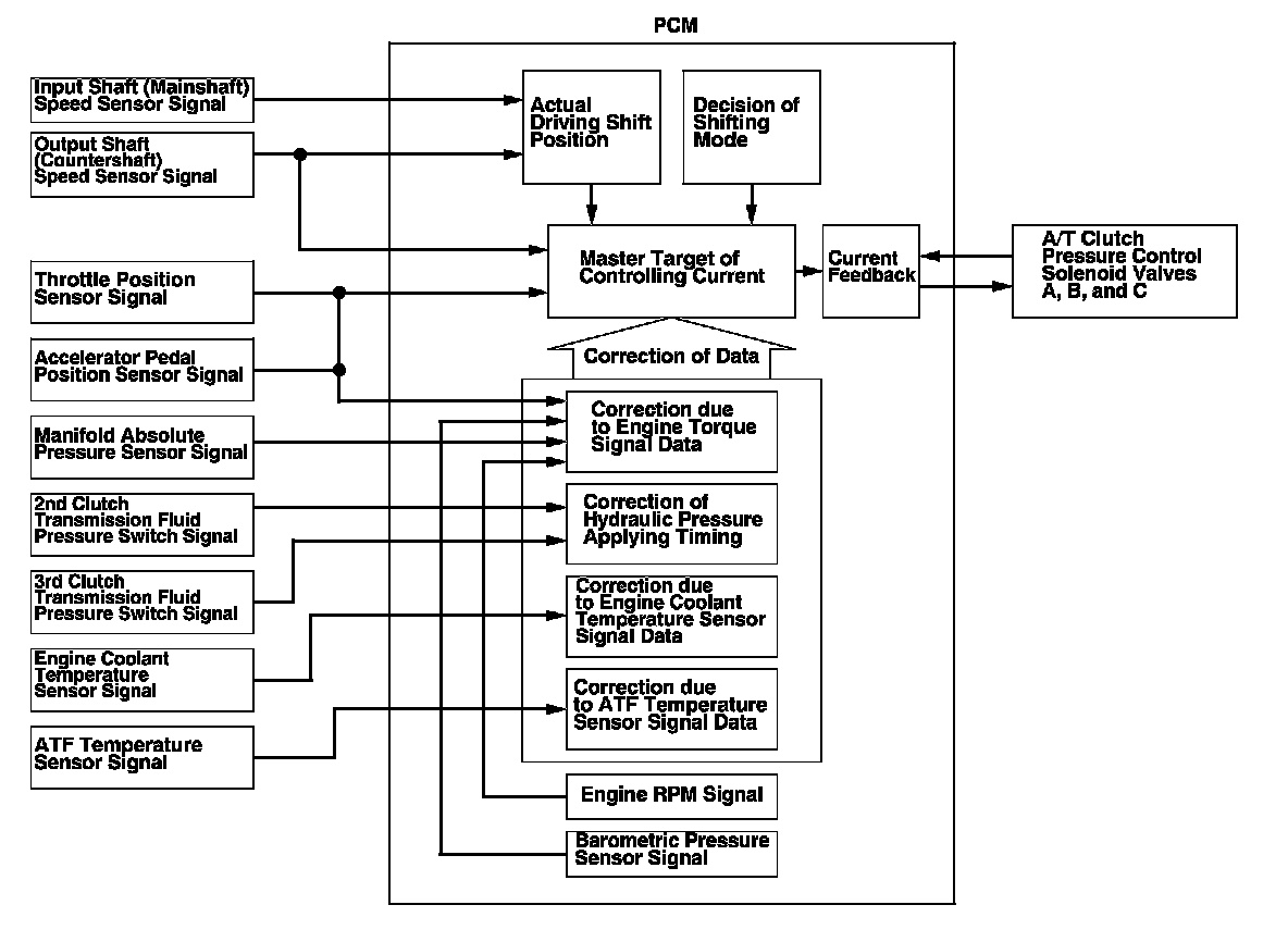 The PCM actuates A/T clutch pressure control solenoid valves A, B, and C to control the clutch pressure. When shifting between the lower and higher gears, the clutch pressure regulated by A/T clutch pressure control solenoid valves A, B, and C engages and disengages the clutch smoothly.