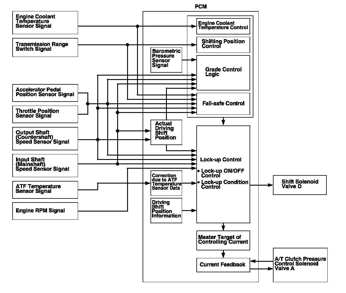 The PCM receives input signals from the sensors, switches, and other control units, processes data, and outputs signals for the engine control system and A/T control system. The A/T control system includes shift control, clutch pressure control, and lock-up control. The PCM switches the shift solenoid valves and the A/T clutch pressure control solenoid valves ON and OFF to control gear selection and torque converter clutch lock-up.