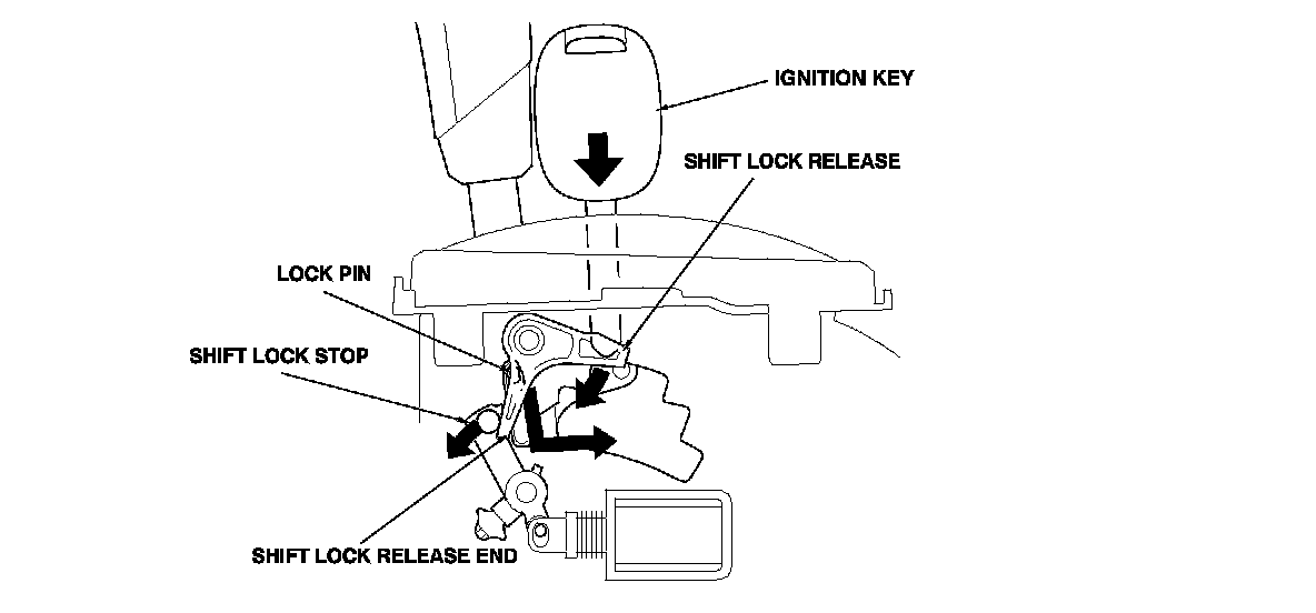 When a shift lock control system malfunction or a mechanical problem occurs, the shift lever can be shifted out of P temporarily by pressing the shift lock release with the ignition key or a screwdriver. Pushing the shift lock release releases the shift lock stop, and allows the shift lever to be shifted out of P.
