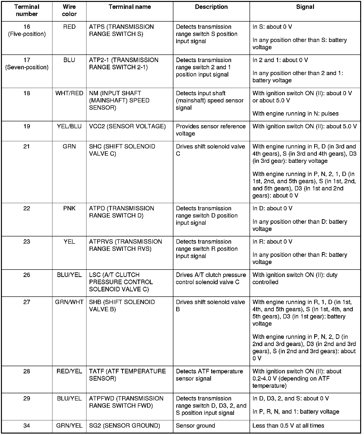 The combination of driving signals to shift solenoid valves A, B, C, and D are shown in the table.