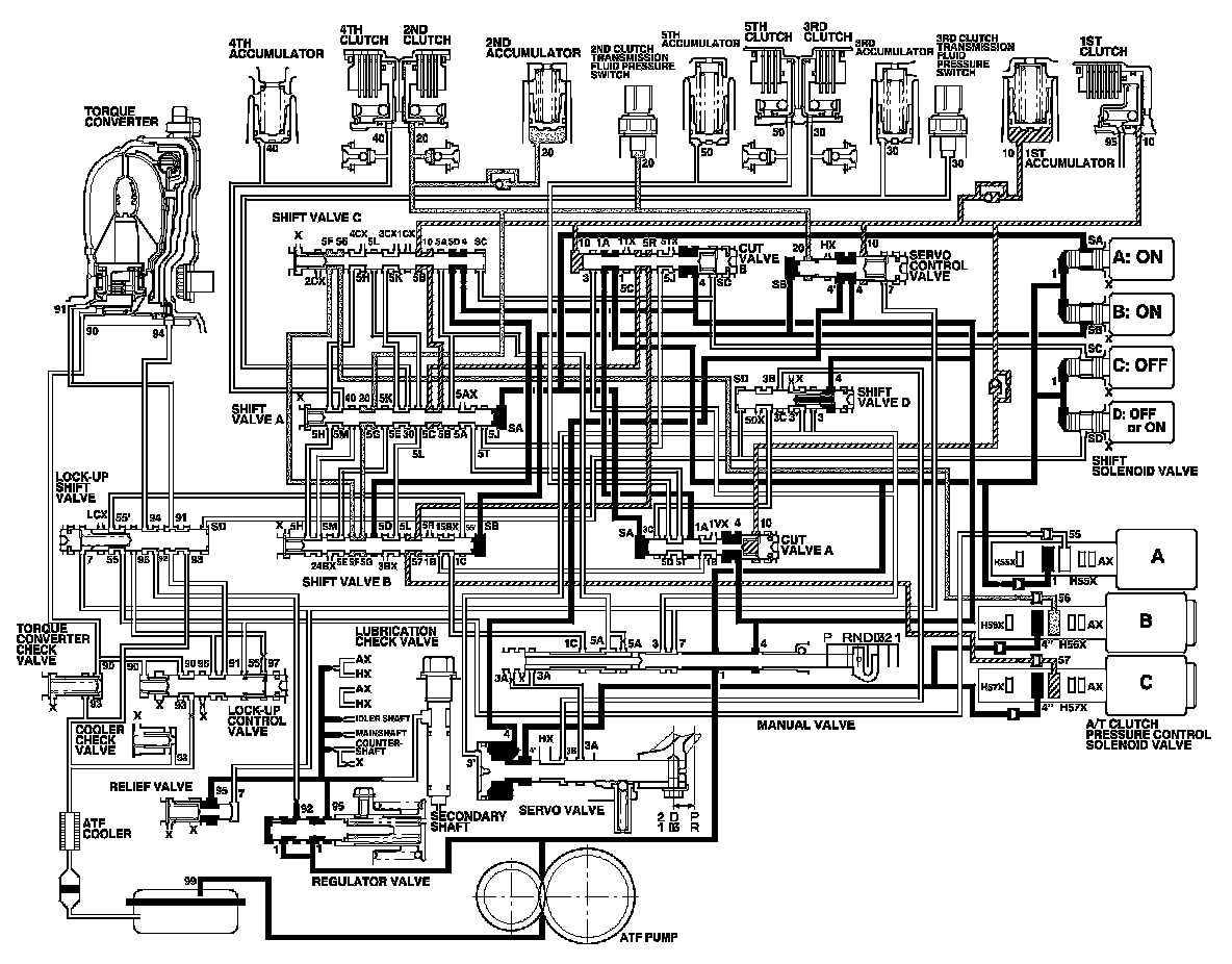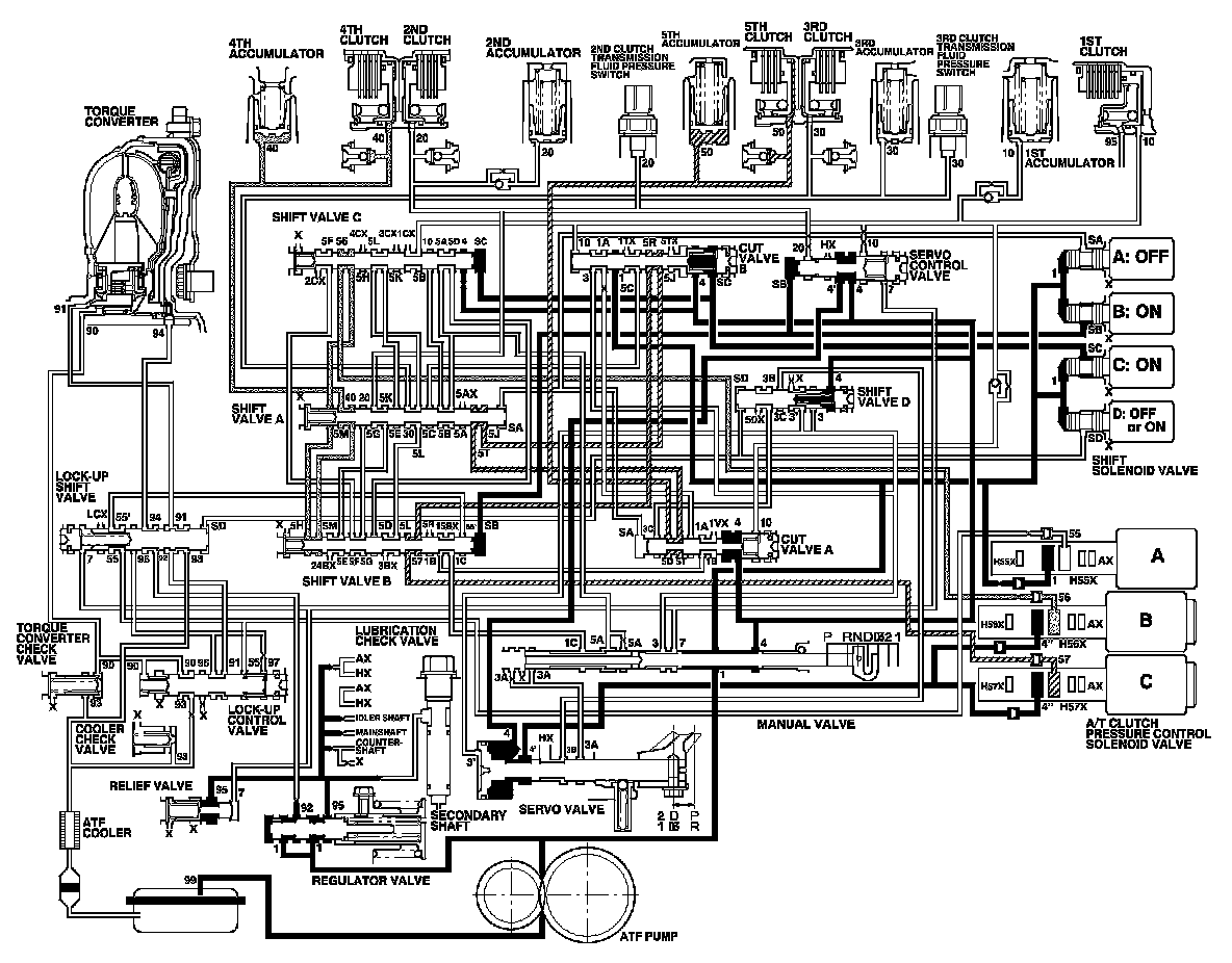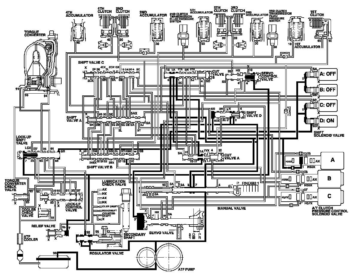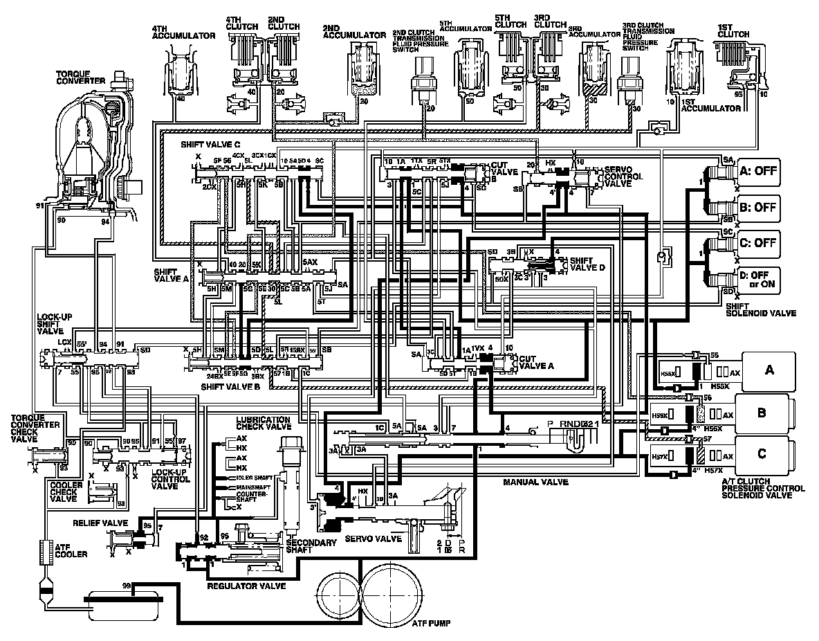 When shifting into R from P or N, line pressure (1) becomes line pressure (1), (3), and (7) at the manual valve. The PCM turns shift solenoid valve D ON, and shift solenoid valves A, B, and C OFF. Shift solenoid valve D pressure (SD) is applied to the left end of shift valve D, and shift valve D is moved to the right side to uncover the line pressure port (3) leading to the servo valve. Line pressure (3') from shift valve D flows to the servo valve, and pushes the servo valve to the reverse position. The PCM controls A/T clutch pressure control solenoid valve A to regulate A/T clutch pressure control solenoid valve A pressure (55), and A/T clutch pressure control solenoid valve A pressure (55) flows to the lock-up shift valve, shift valve B, the manual valve, the servo valve, shift valve D, and cut valve A. A/T clutch pressure control solenoid valve A pressure (3C) becomes 5th clutch pressure (50) at cut valve A. 5th clutch pressure (50) is applied to the 5th clutch, and the 5th clutch is engaged with the A/T clutch pressure control solenoid valve A pressure.