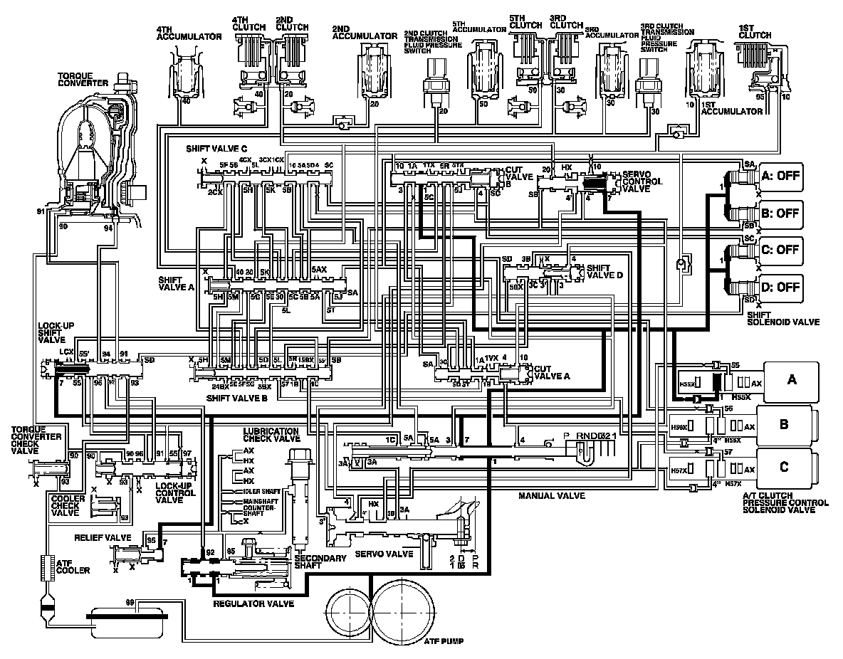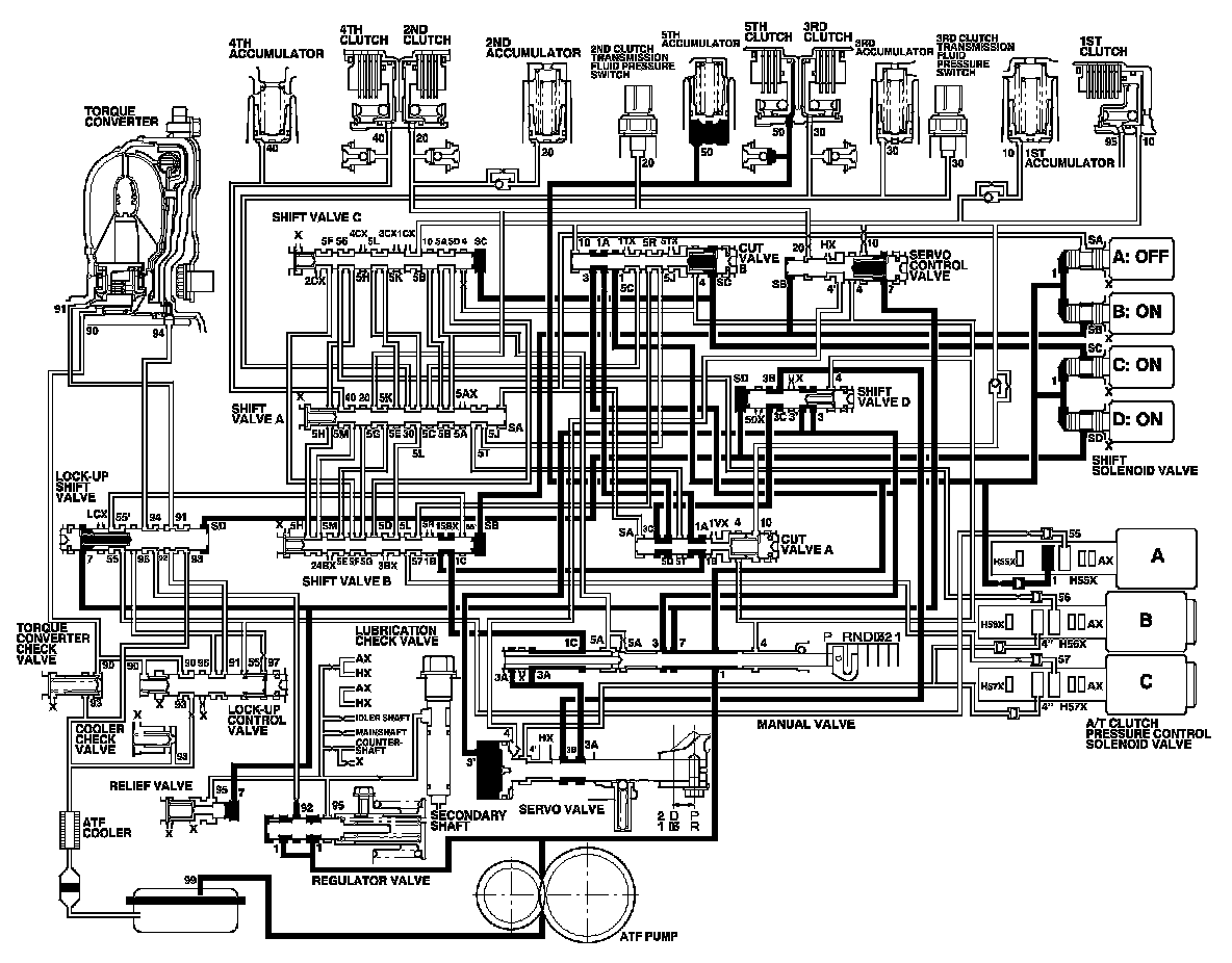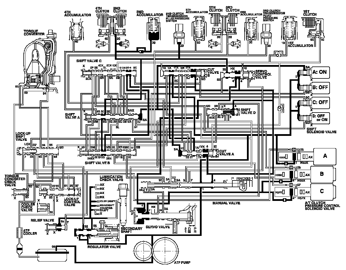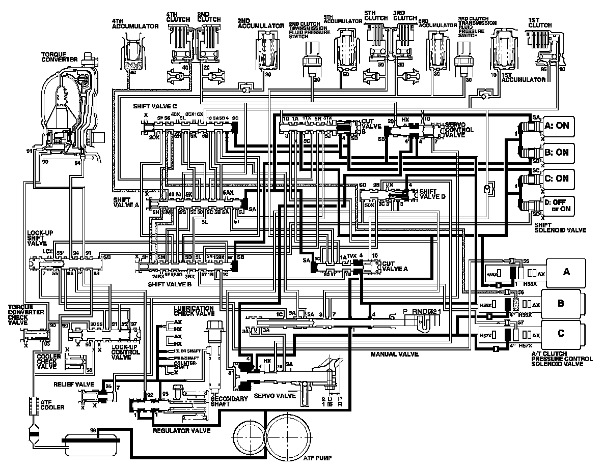 When shifting into R from P or N, line pressure (1) becomes line pressure (1), (3), and (7) at the manual valve. The PCM turns shift solenoid valve D ON, and shift solenoid valves A, B, and C OFF. Shift solenoid valve D pressure (SD) is applied to the left end of shift valve D, and shift valve D is moved to the right side to uncover the line pressure port (3) leading to the servo valve. Line pressure (3') from shift valve D flows to the servo valve, and pushes the servo valve to the reverse position. The PCM controls A/T clutch pressure control solenoid valve A to regulate A/T clutch pressure control solenoid valve A pressure (55), and A/T clutch pressure control solenoid valve A pressure (55) flows to the lock-up shift valve, shift valve B, the manual valve, the servo valve, shift valve D, and cut valve A. A/T clutch pressure control solenoid valve A pressure (3C) becomes 5th clutch pressure (50) at cut valve A. 5th clutch pressure (50) is applied to the 5th clutch, and the 5th clutch is engaged with the A/T clutch pressure control solenoid valve A pressure.