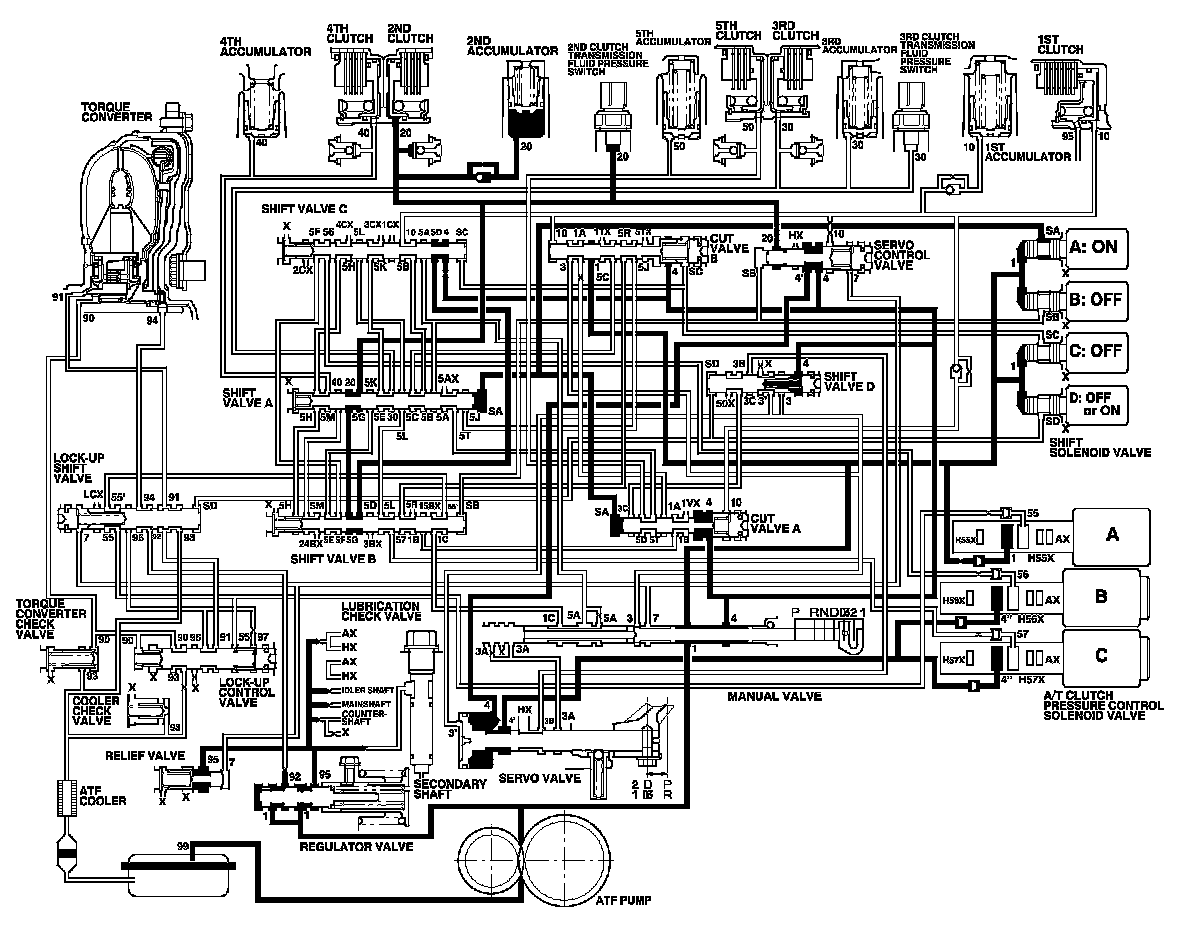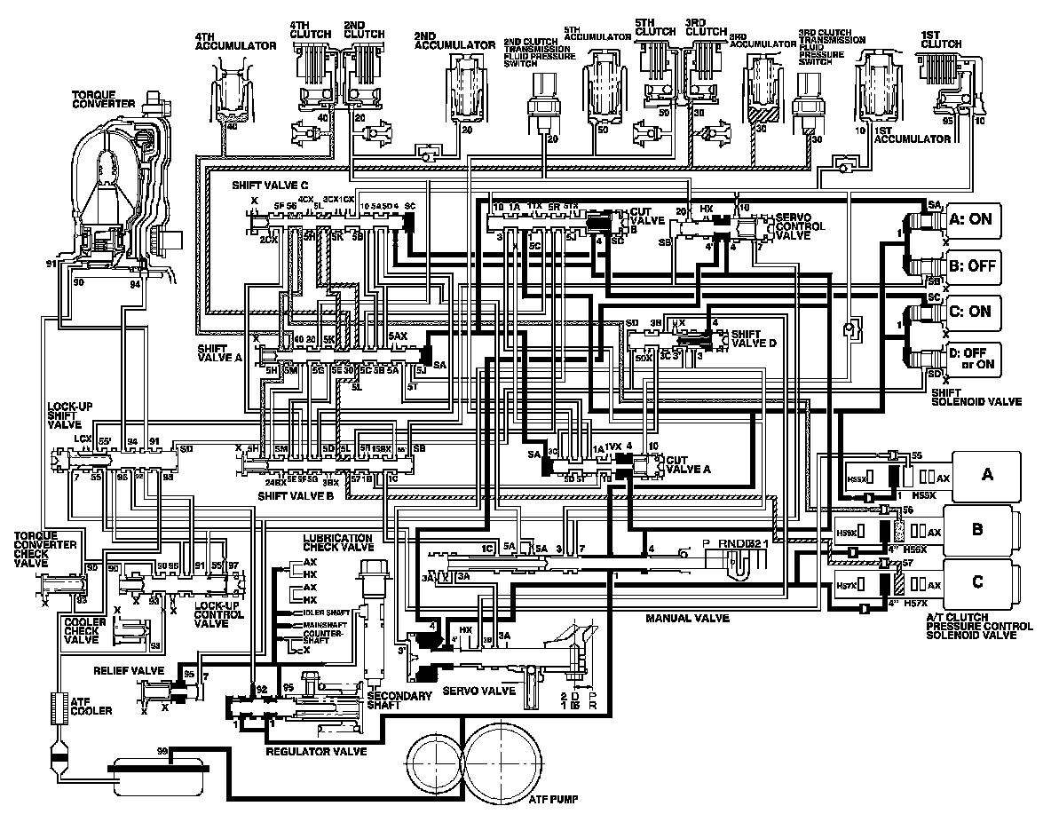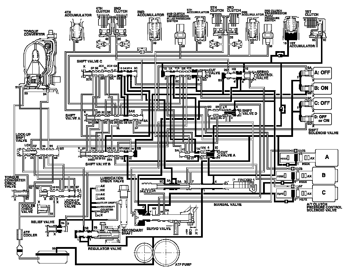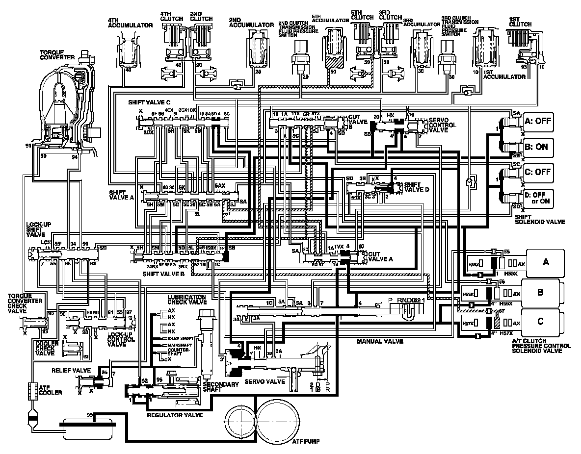 When shifting into R from P or N, line pressure (1) becomes line pressure (1), (3), and (7) at the manual valve. The PCM turns shift solenoid valve D ON, and shift solenoid valves A, B, and C OFF. Shift solenoid valve D pressure (SD) is applied to the left end of shift valve D, and shift valve D is moved to the right side to uncover the line pressure port (3) leading to the servo valve. Line pressure (3') from shift valve D flows to the servo valve, and pushes the servo valve to the reverse position. The PCM controls A/T clutch pressure control solenoid valve A to regulate A/T clutch pressure control solenoid valve A pressure (55), and A/T clutch pressure control solenoid valve A pressure (55) flows to the lock-up shift valve, shift valve B, the manual valve, the servo valve, shift valve D, and cut valve A. A/T clutch pressure control solenoid valve A pressure (3C) becomes 5th clutch pressure (50) at cut valve A. 5th clutch pressure (50) is applied to the 5th clutch, and the 5th clutch is engaged with the A/T clutch pressure control solenoid valve A pressure.