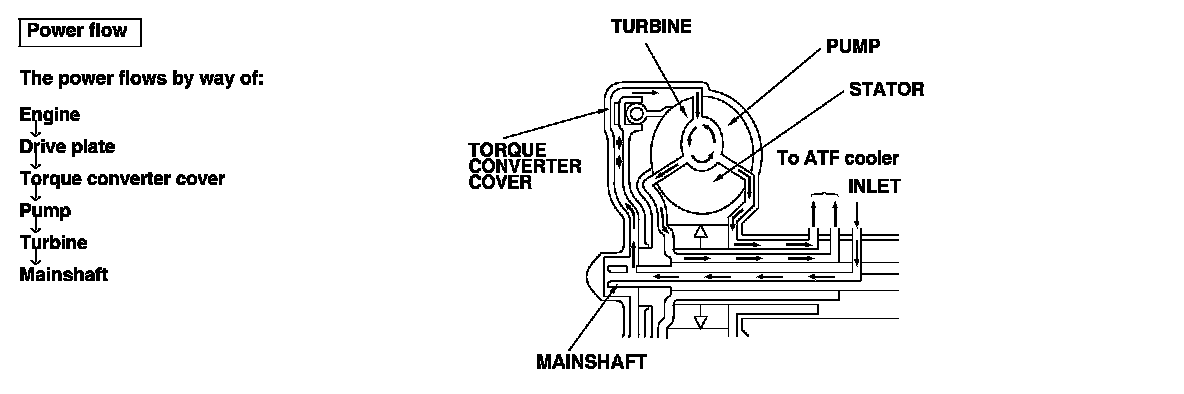 Fluid entered from the chamber between the torque converter cover and the torque converter clutch piston passes through the torque converter and goes out from the chambers between the turbine and the stator, and between the pump and the stator. As a result, the torque converter clutch piston moves away from the torque converter cover, and the torque converter clutch lock-up is released; torque converter clutch lock-up is OFF.