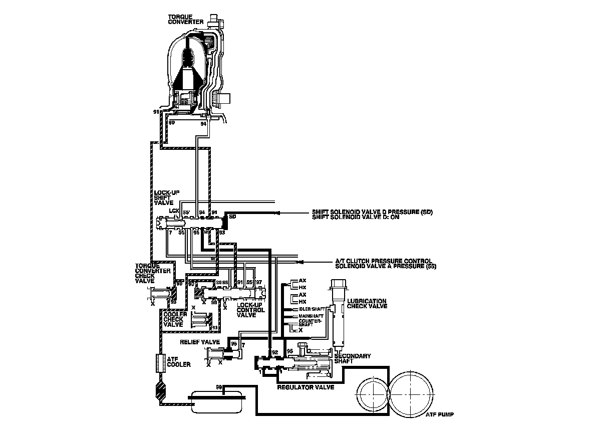 As the speed of the vehicle reaches the programmed value, the PCM turns shift solenoid valve D ON. Shift solenoid valve D pressure (SD) is applied to the right end of the lock-up shift valve to switch the torque converter pressure port leading to the front of the torque converter. Torque converter pressure (91) enters into the front of the torque converter to engage the torque converter clutch piston. The PCM also controls A/T clutch pressure control solenoid valve A to regulate A/T clutch pressure control solenoid valve A pressure (55), and A/T clutch pressure control solenoid valve A pressure (55) is applied to the lock-up control valve. Torque converter pressure (94) drained from the back of the torque converter is applied to the right side of the lock-up control valve, and torque converter pressure (90) is applied to the left side of the lock-up control valve. The lock-up control valve controls the amount of the lock-up by receiving these pressures. The torque converter clutch is engaged partially when torque converter pressure (90) in the left side of the lock-up control valve is higher, and the torque converter clutch is engaged securely according to the amount of pressure in the right side of the lock-up control valve. Under this condition, the torque converter clutch is engaged by pressure entering into the front side of the torque converter; this condition is partial lock-up.