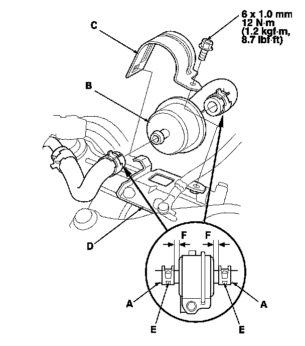 6. Slide the ATF cooler hose on the ATF filter until the hose end contacts the filter housing, and secure the hose with the clip (E) at 6-8 mm (0.24-0.31 in.) (F) from the filter housing. Install the cooler hose on the other side of the ATF filter in the same manner.