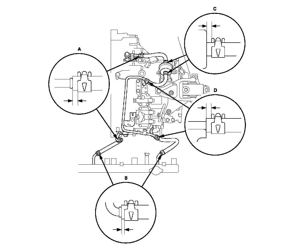 2. Install the ATF cooler hoses over the ATF cooler lines, and secure the hoses with the clips as shown in the details (A) (B) (C) (D), shown in the following figure. Keep the tabs of the clips clear of other parts.