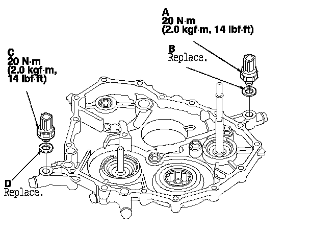 6. Install the new 3rd clutch transmission fluid pressure switch and a new sealing washer (D), and tighten the metal part of the switch.
