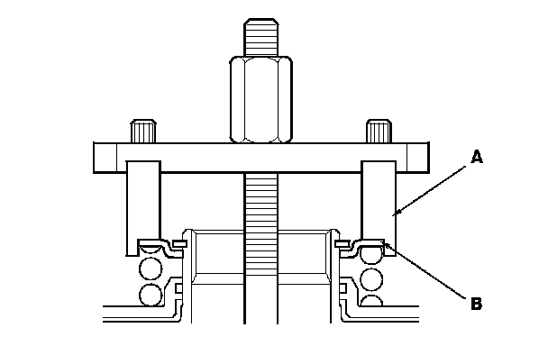 7. Be sure the clutch spring compressor attachment (A) is adjusted to have full contact with the spring retainer (B), and set either end of the clutch spring compressor attachment over the clutch return spring end.