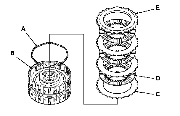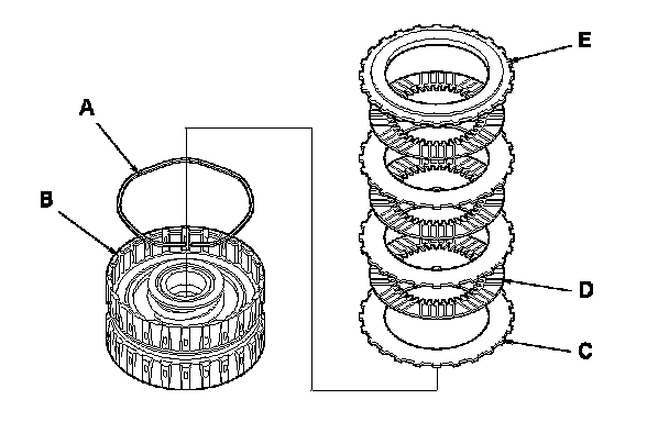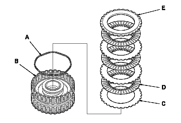 13. Install the wave spring (A) in the 4th clutch drum (B). Starting with the clutch flat-plate, alternately install the flat-plates (C) (4) and the discs (D) (4). Install the clutch end-plate (E) with the flat side down on the top disc.