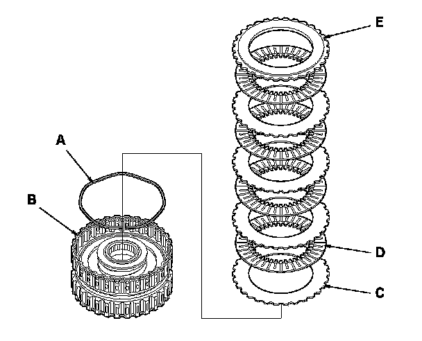 14. Install the wave spring (A) in the 3rd clutch drum (B). Starting with the clutch wave-plate, alternately install the wave-plates (C) (3) and the discs (D) (3). Install the clutch end-plate (E) with the flat side down on the top disc.