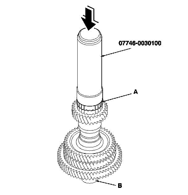 3. Slide the reverse selector hub (A) over the countershaft (B), then press it in place using the driver handle (40 mm I.D.) and a press.