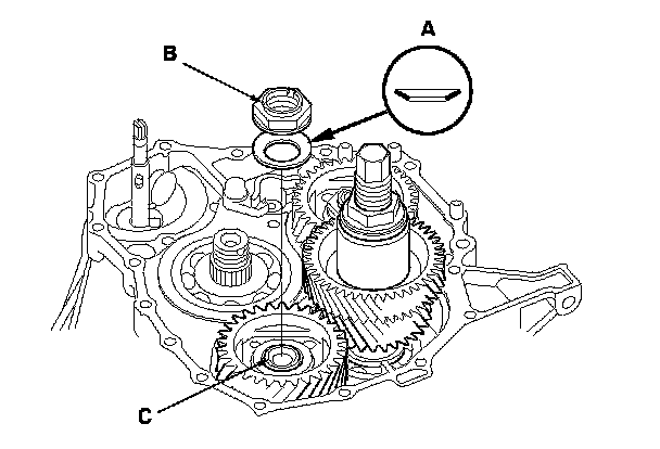 7. Install the old conical spring washer (A) and the old locknut (B) on the secondary shaft (C), and tighten the locknut to 226 N-m (23.0 kgf-m, 166 lbf-ft).