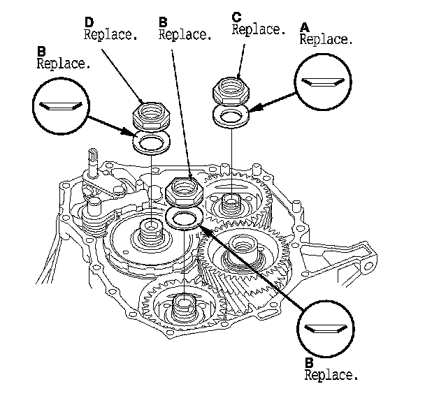17. Install the new conical spring washers (A) (B) in the direction shown, and install the new mainshaft locknut (C), the new countershaft locknut (D), and the new secondary shaft locknut (E).