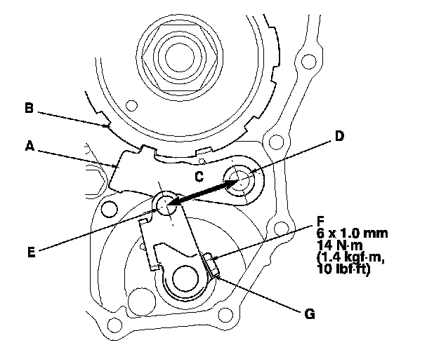 23. Tighten the lock bolt (F), and bend the lock tab of the lock washer (G) against the bolt head.