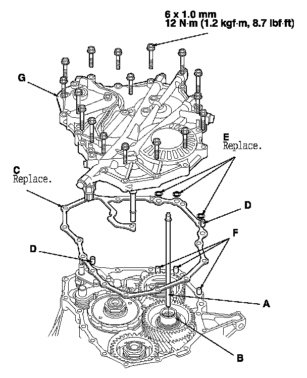 25. Install the new gasket (C) on the transmission housing, and install the two dowel pins (D) and new O-rings (E) over the top of the ATF feed pipes (F).