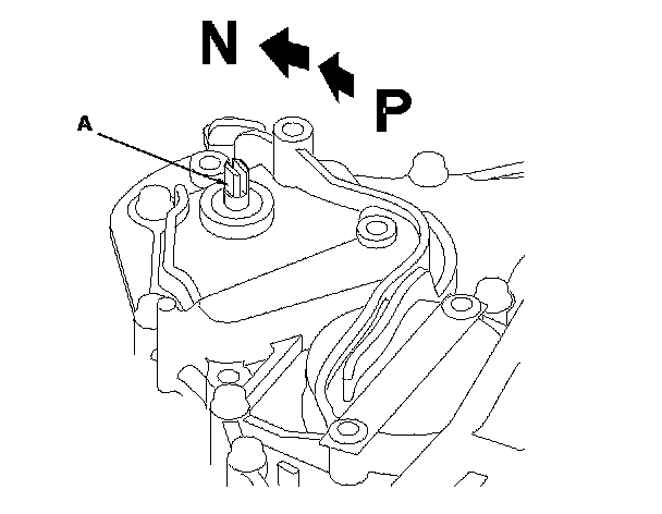 27. Using the selector control shaft end on the torque converter housing side, turn the control shaft (A) fully clockwise (view from end cover) to the P position. Turn the control shaft back two click-stopped positions so that it is in the N position.