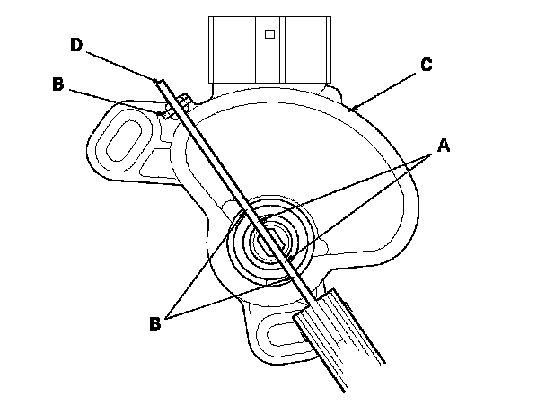 28. Align the cutouts (A) on the rotary-frame with the neutral positioning cutouts (B) on the transmission range switch (C), then put a 2.0 mm (0.08 in.) feeler gauge blade (D) in the cutouts to hold the switch in the N position.