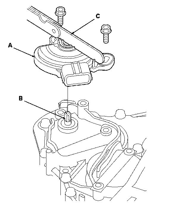 29. Install the transmission range switch (A) gently on the selector control shaft (B) while holding it in the N position with the 2.0 mm (0.08 in.) blade (C).