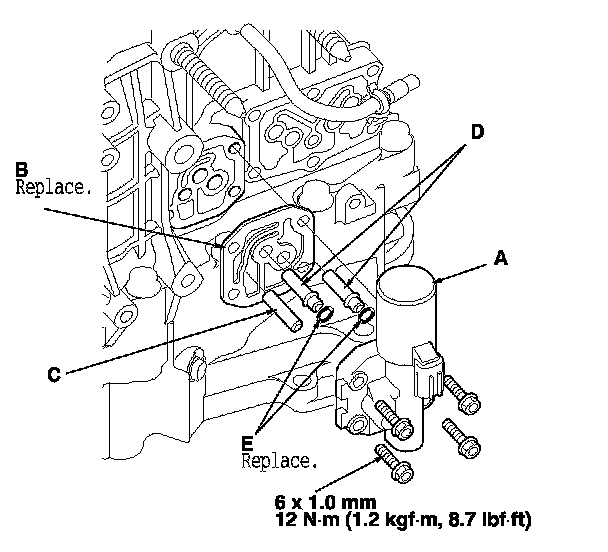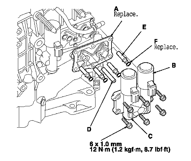 40. Install the ATF pipe (D) and the ATF joint pipes (E), and install the new O-rings (F) over the ATF joint pipes.
