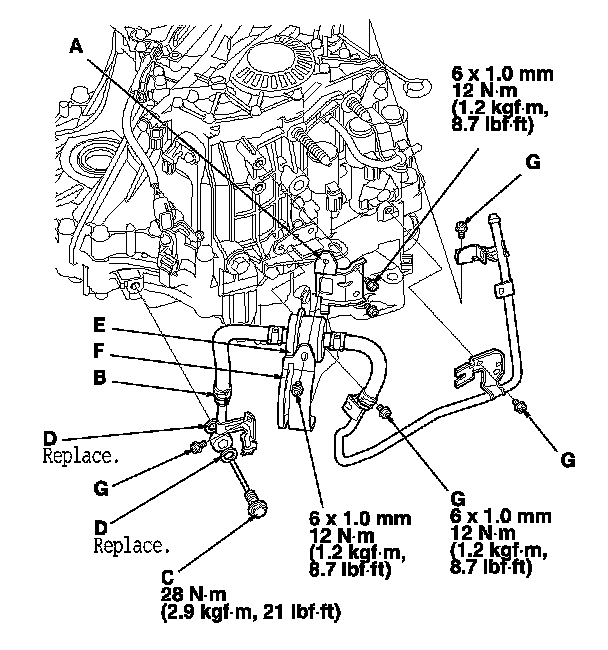 49. Secure the inlet line with the bolts (G) on the transmission.