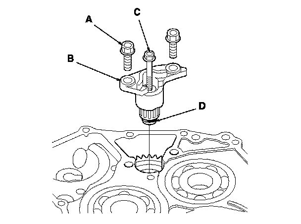 2. Install a 5 x 0.8 mm bolt (C) in the reverse gear shaft, and pull it to remove the reverse idler gear shaft (D) and the gear shaft holder together.