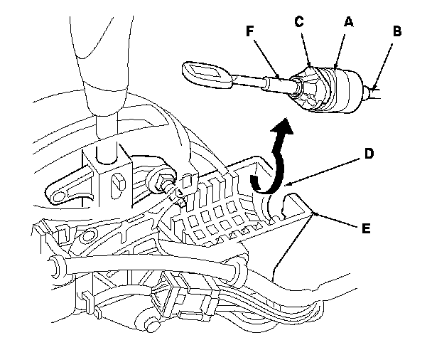 4. Rotate the socket holder (A) on the shift cable (B) a quarter turn; the corner (C) on the socket holder will be in the opening (D) of the shift lever bracket base (E). Then slide the holder to remove the shift cable from the bracket. Do not remove the shift cable by twisting the shift cable guide (F).
