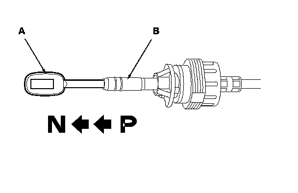 5. Push the shift cable (A) until it stops, then release it. Pull the shift cable back two steps so that the shift position is in N. Do not hold the shift cable guide (B) to adjust the shift cable.